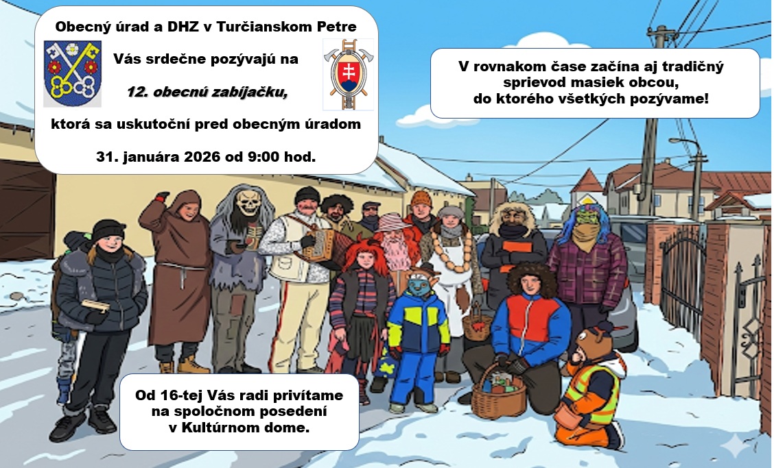 Srdečne vás pozývame na sprievod masiek a 12. obecný zabíjačku, ktoré organizuje Obecný úrad spolu s DHZ v Turčianskom Petre. Tieto podujatia sa uskutočnia 31. januára 2026 od 9:00 hod. pred obecným úradom. Od 16:00 sa môžete tešiť na spoločné posedenie, ktoré sa bude konať v Kultúrnom dome. Príďte stráviť príjemný deň v spoločnosti a zažiť tradičné zvyky našej obce.