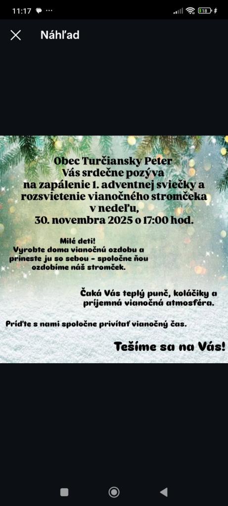 Dňa 30. novembra 2025 o 17:00 hod. pozývame všetkých na zapálenie prvej adventnej sviečky a rozsvietenie vianočného stromčeka. Milé deti, nezabudnite si priniesť vianočnú ozdobu, ktorou spoločne ozdobíme náš stromček. Čaká vás teplý punč, koláčiky a krásna vianočná atmosféra. Príďte s nami privítať vianočný čas a zažiť nezabudnuteľné chvíle plné radosti a pohody. Tešíme sa na vašu účasť!